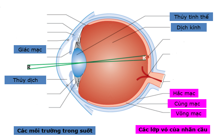 Để chúng ta thấy được một vật, ánh sáng từ vật cần truyền đến võng mạc mắt, đi qua lần lượt các thành phần trong suốt của mắt. Ánh sáng đi vào mắt thông qua giác mạc ở ngoài cùng của tròng đen, xuyên qua lỗ đồng tử đến thủy tinh thể. Giữa giác mạc và thủy tinh thể là môi trường chất lỏng trong suốt gọi là thủy dịch, có vai trò nuôi dưỡng giác mạc và đảm bảo môi trường trong suốt cho ánh sáng đi qua. Ánh sáng sẽ truyền qua thủy tinh thể được treo lơ lửng giữa nhãn cầu nằm bằng các dây chằng Zinn ngay sau lỗ đồng tử. Khi qua được giác mạc và thủy tinh thể, ánh sáng sẽ được hội tụ và truyền tiếp qua môi trường trong suốt khác là dịch kính để cho ảnh trên võng mạc. Ánh sáng của vật sau đó sẽ được chuyển thành các tín hiệu điện ở võng mạc nhờ vào các tế bào thị giác của võng mạc và theo thần kinh thị giác (gai thị) truyền đến não.