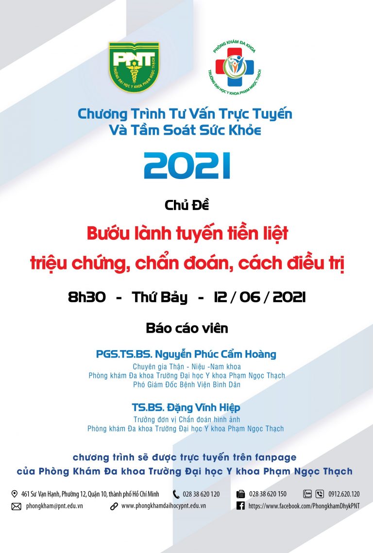 Chương trình Giáo dục Sức khỏe admin Posted on 3 Tháng 6, 2021 Bướu lành Tuyến tiền liệt Triệu chứng – Chẩn đoán – Điều trị Chương trình sẽ được trực tuyến trên fanpage Facebook của phòng khám vào sáng ngày 12/6/2021. Kính mời quý vị và các bạn đón xem.