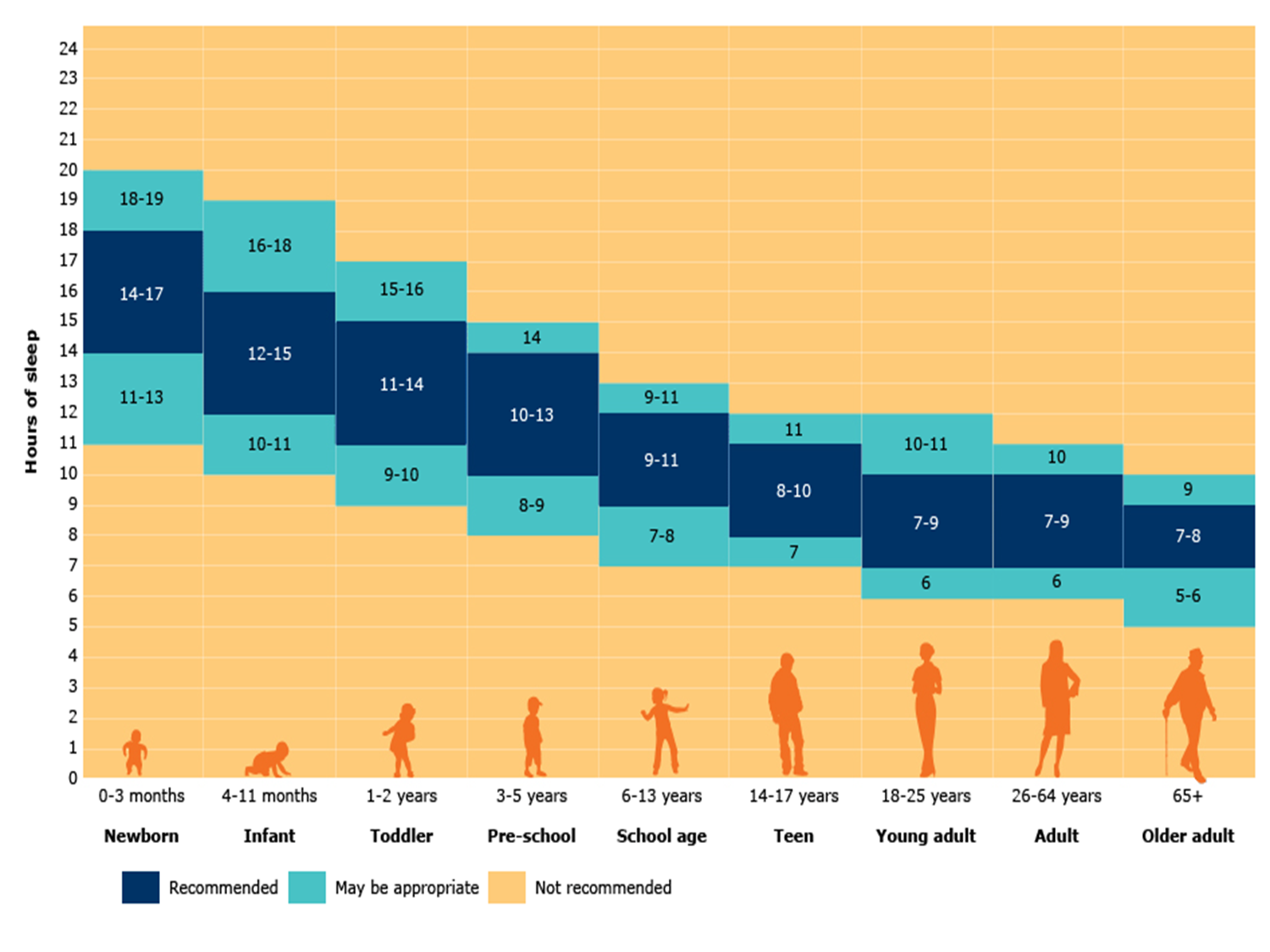 Hình: Khuyến nghị về thời lượng giấc ngủ theo độ tuổi từ National Sleep Foundation