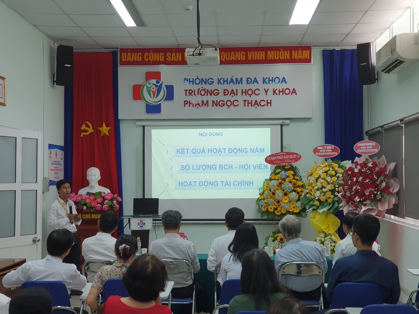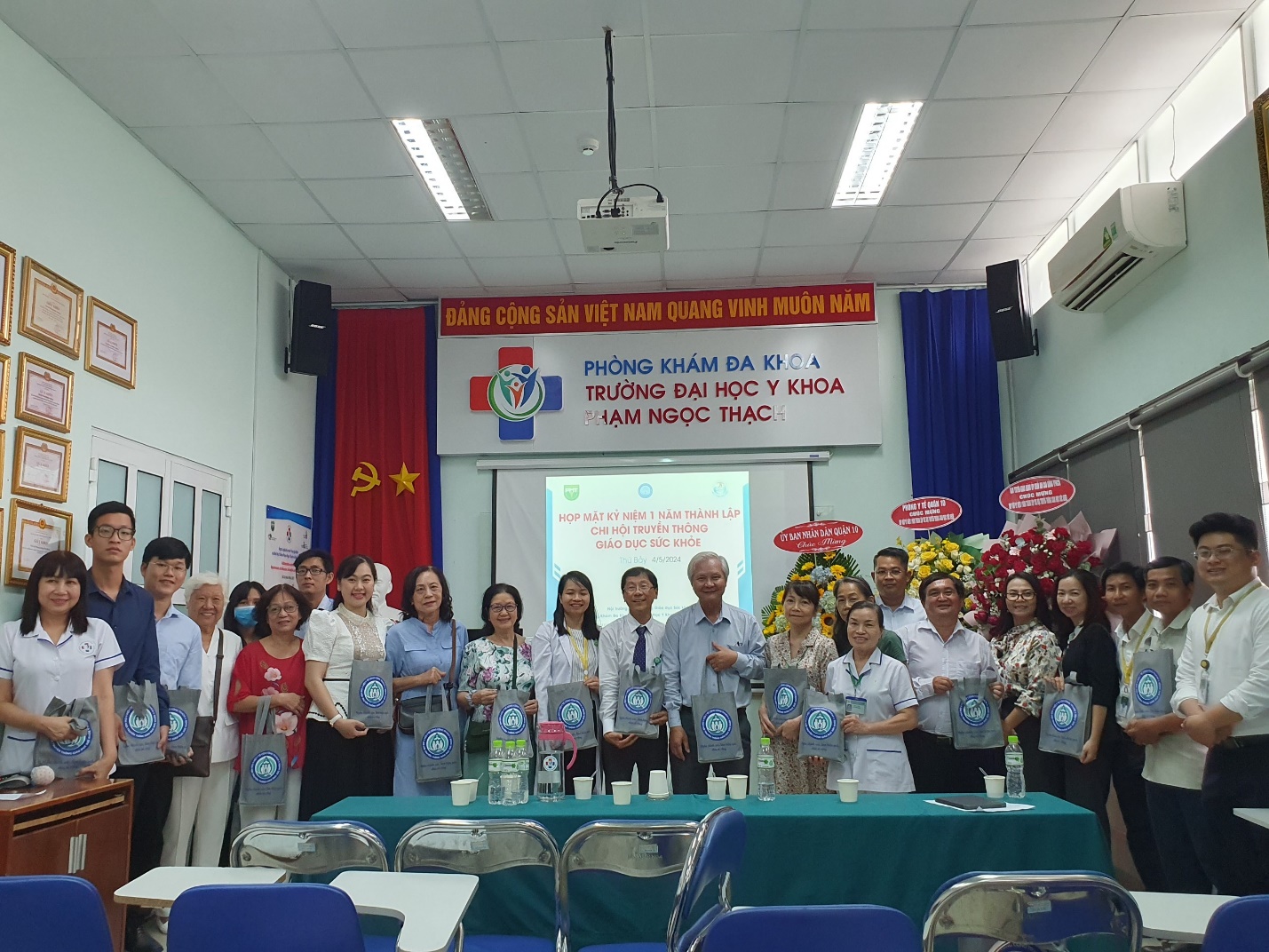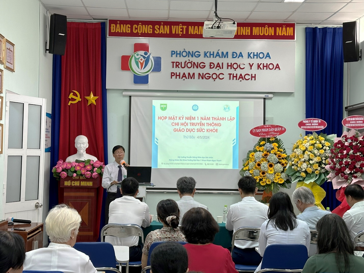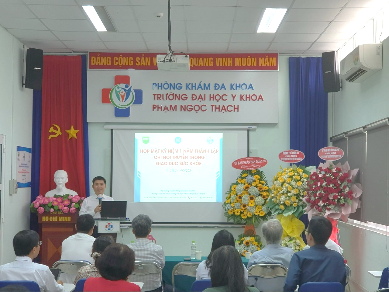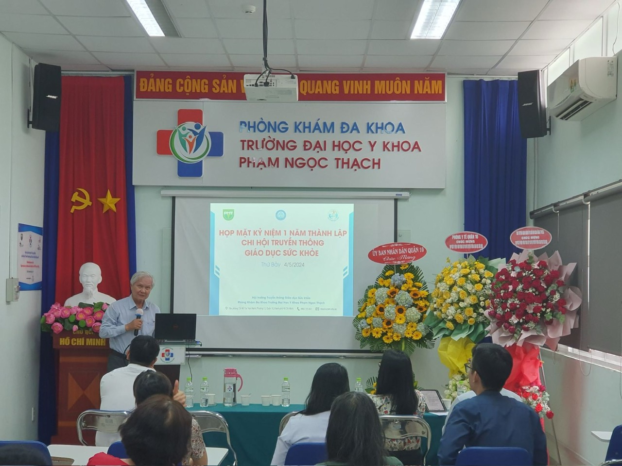Để nhìn lại những bước phát triển và thành tựu ban đầu sau 1 năm thành lập, Chi hội Truyền thông Giáo dục Sức khỏe – Hội Y tế Công cộng TP.HCM đã tổ chức họp mặt kỷ niệm 1 năm ngày thành lập (27/3/2023 – 27/3/2024) vào ngày 04/5/2024 tại Hội trường Truyền thông Giáo dục sức khỏe, Phòng khám Đa khoa Trường Đại học Y khoa Phạm Ngọc Thạch. PGS.TS.BS. Nguyễn Thanh Hiệp – Phó Bí thư Đảng ủy, Phó Chủ tịch Hội đồng Trường, Hiệu trưởng Trường ĐHYK Phạm Ngọc Thạch; PGS.TS.BS. Châu Văn Trở – Trưởng Phòng khám Đa khoa đã tham dự buổi họp mặt. Buổi họp mặt đã đón tiếp TS.BS. Lê Trường Giang, Chủ tịch và ThS.BS.Vũ Nguyên Thanh, Chánh văn phòng Hội Y tế Công cộng TP.HCM. Về phía địa phương, có sự hiện diện của BS.CKII. Phan Thanh Tâm – Giám đốc Trung tâm Y tế Quận 10, BS.CKI. Lê Hồng Tây – Trưởng Phòng Y tế Quận 10 và bà Nguyễn Thị Kim Uyên – Phó trưởng Phòng Giáo dục Quận 10, cùng các khách mời và các chi hội viên đã đồng hành cùng Chi hội hơn 1 năm qua.