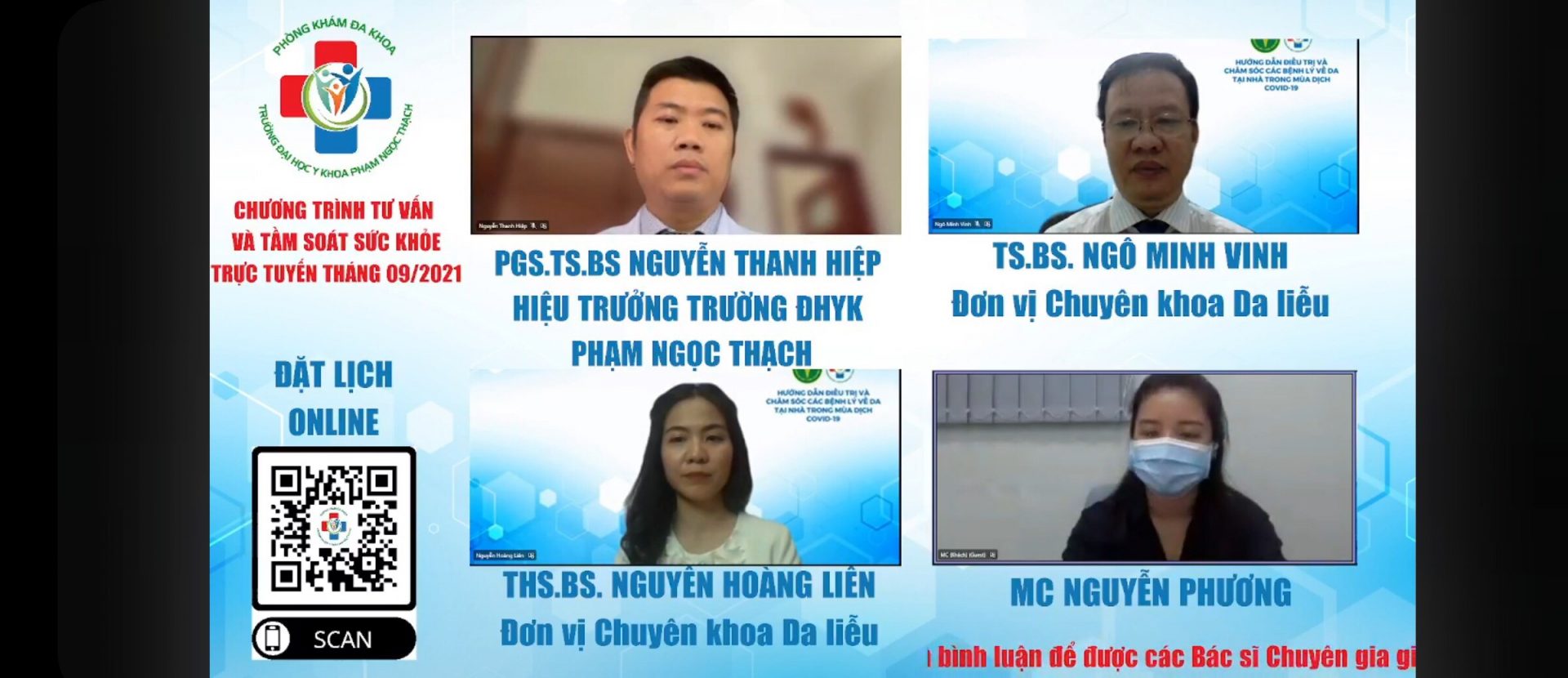 Thấu hiểu được những lo lắng và khó khăn của người dân, đơn vị truyền thông của Phòng khám đa khoa đã tổ chức chương trình tư vấn trực tuyến miễn phí với sự tham dự của PGS.TS.BS Nguyễn Thanh Hiệp – Hiệu trưởng Trường Đại học Y khoa Phạm Ngọc Thạch, TS.BS. Ngô Minh Vinh và ThS.BS. Nguyễn Hoàng Liên chuyên gia về da liễu. Chương trình tháng 9 đã tập trung cung cấp thông tin và giải đáp thắc mắc về “Cách chăm sóc, kiểm soát bệnh trứng cá” và “Chăm sóc da bệnh nhân viêm da cơ địa tại nhà.