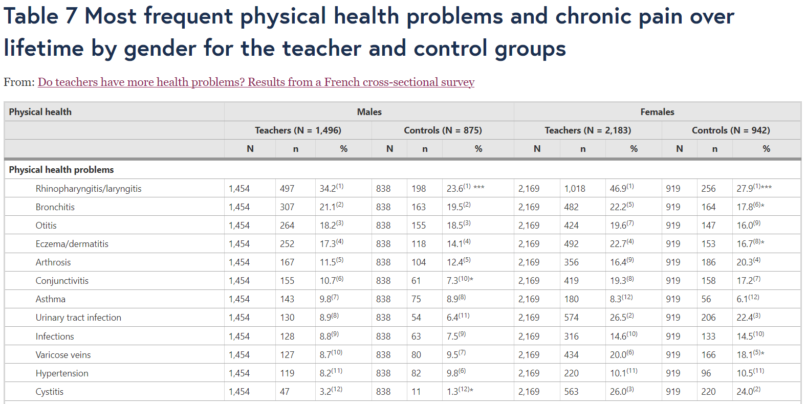 Theo một nghiên cứu tại Đức, giáo viên và nhân viên văn phòng có tỷ lệ mắc bệnh về đường hô hấp chiếm khoảng 19%.Tuy nhiên, một nghiên cứu khác tại Pháp cho thấy tỷ lệ mắc bệnh về đường hô hấp ở giáo viên đứng hàng đầu.